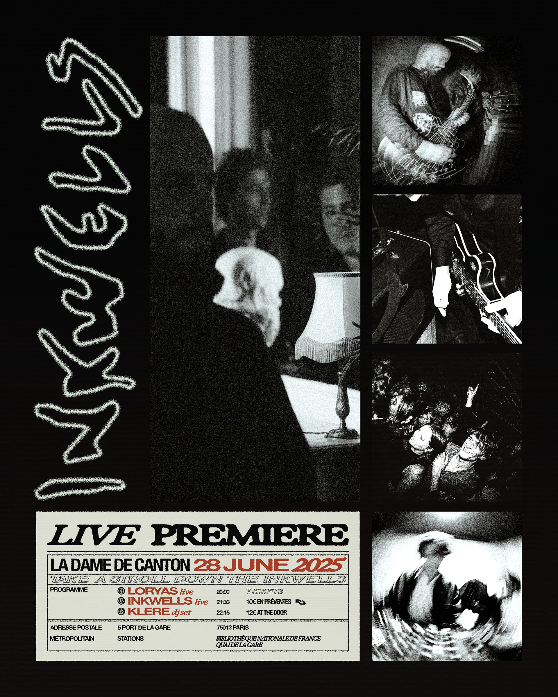 Concert poster & video asset for warehouse rock project Inkwells' live premiere in Paris, 28 June 2025. Featuring camera work by Lorris Perrier.